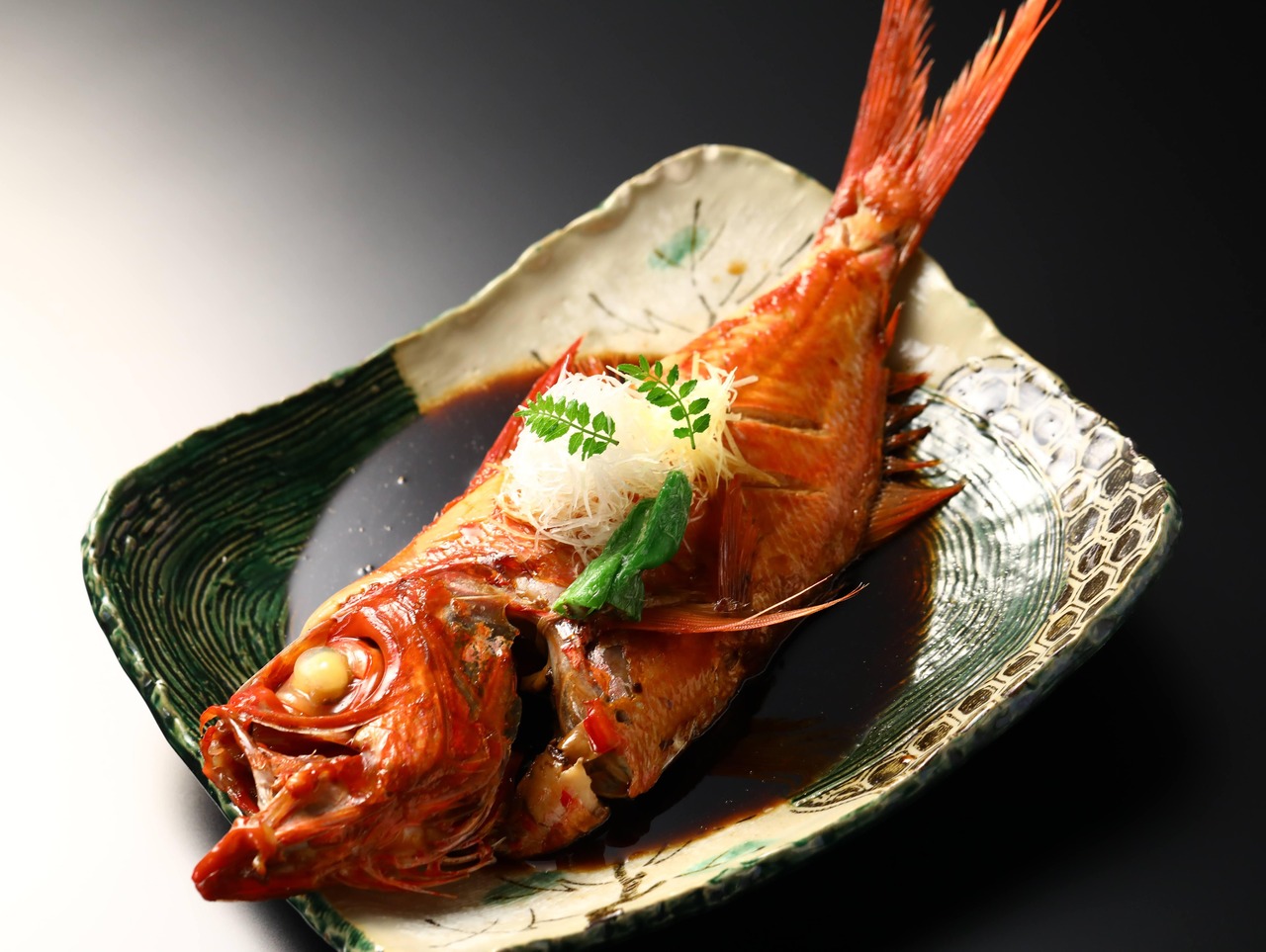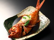 秘伝のたれで炊いた金目鯛姿煮は、地元醤油蔵のたまさ醤油をベースに黒糖、蜂蜜、水飴等を独自に調合したコクのあるまろやかな味で、旅館でも人気の逸品。